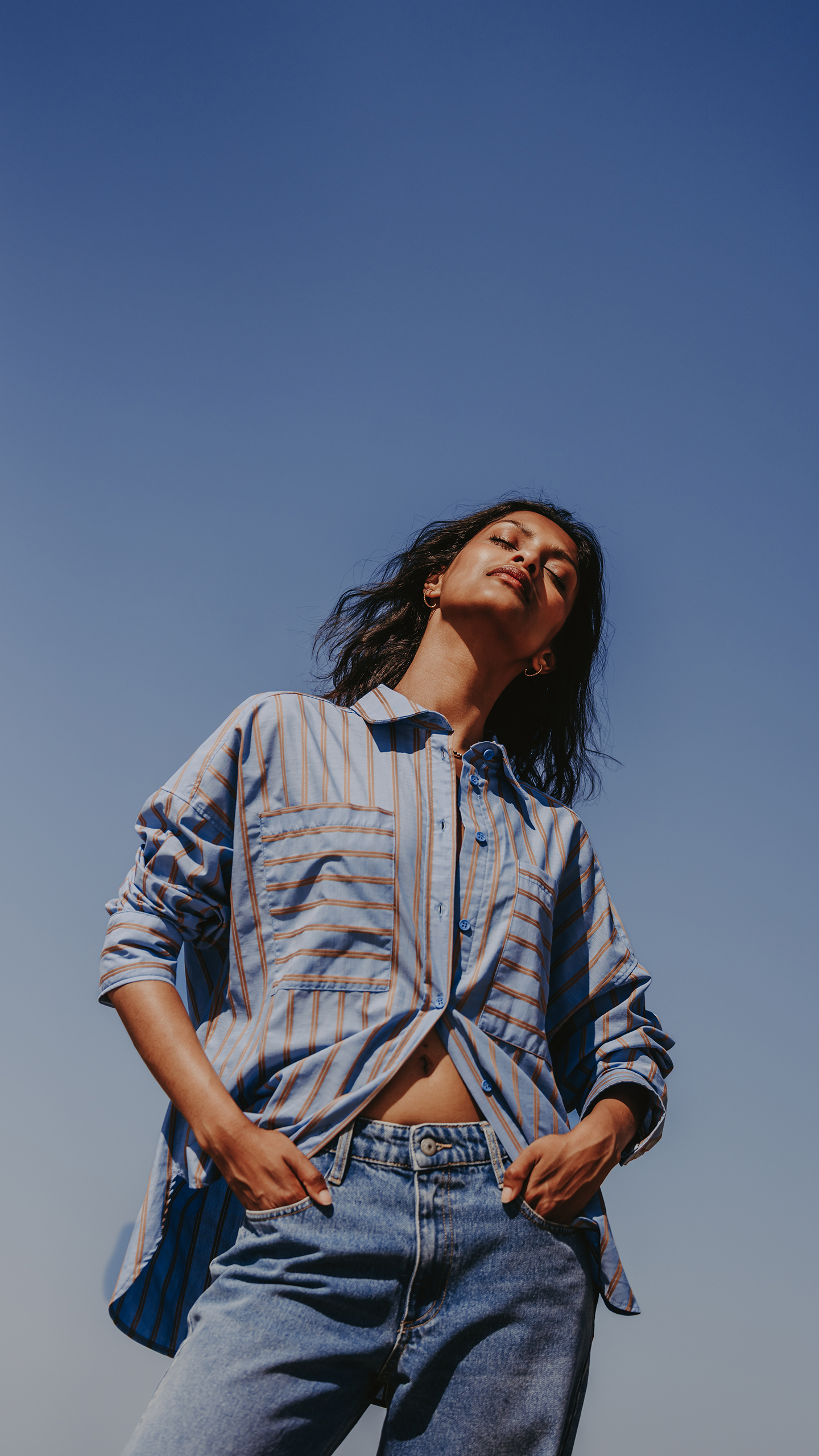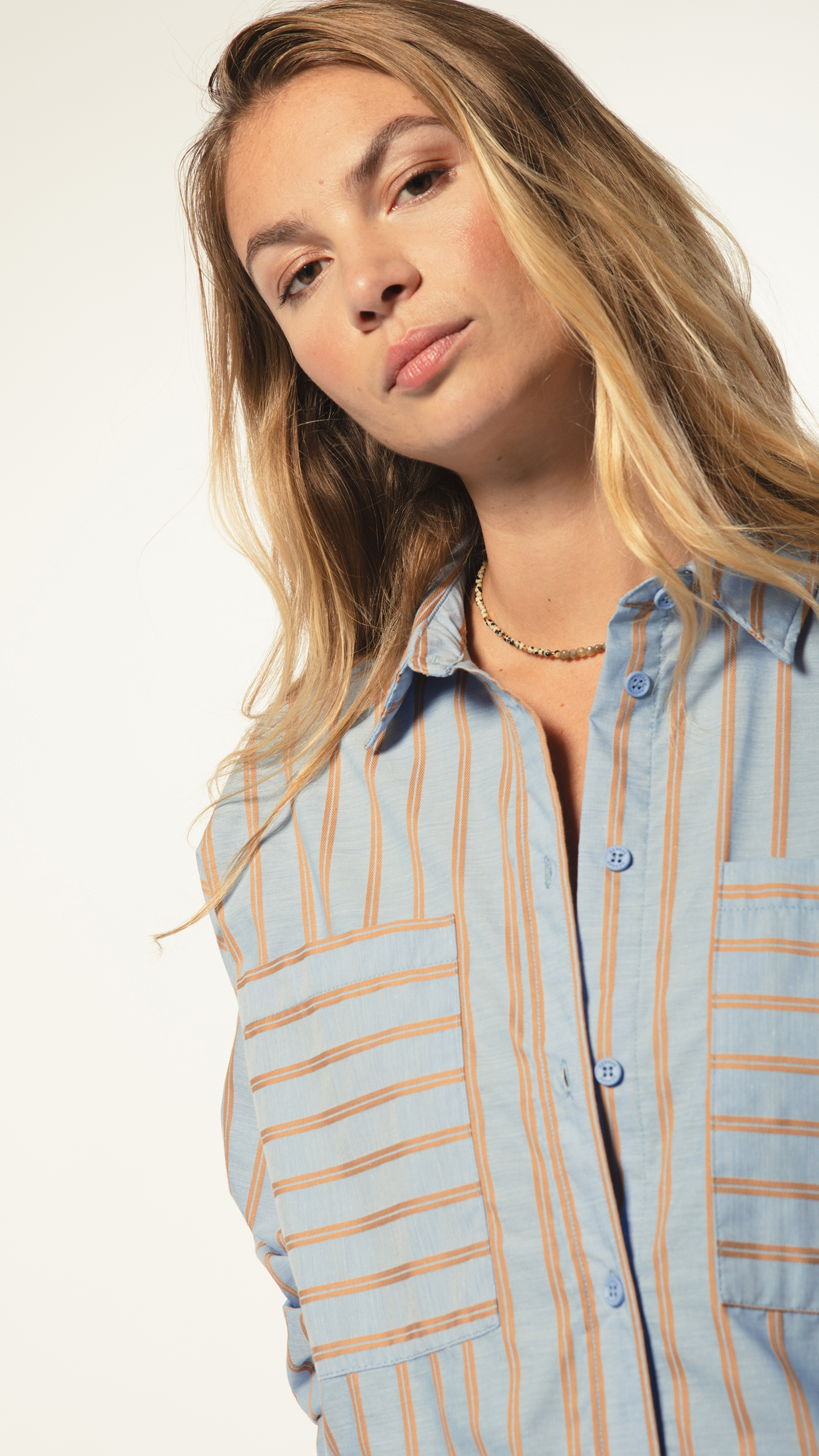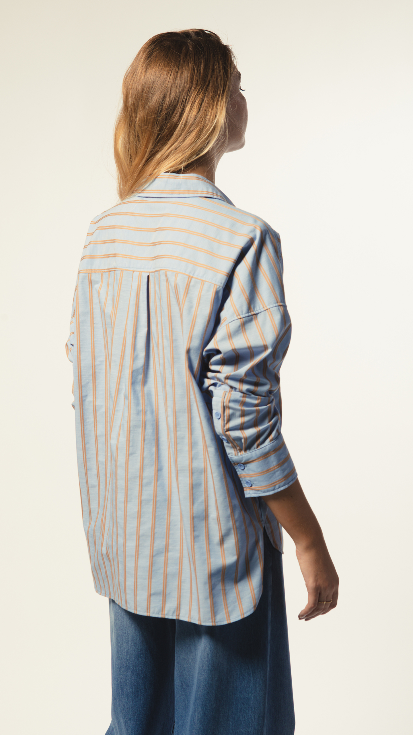 La chemise Anaïs joue avec les codes du masculin-féminin : oversize, épaules descendues, large poche et rayures camel sur fond bleu clair.