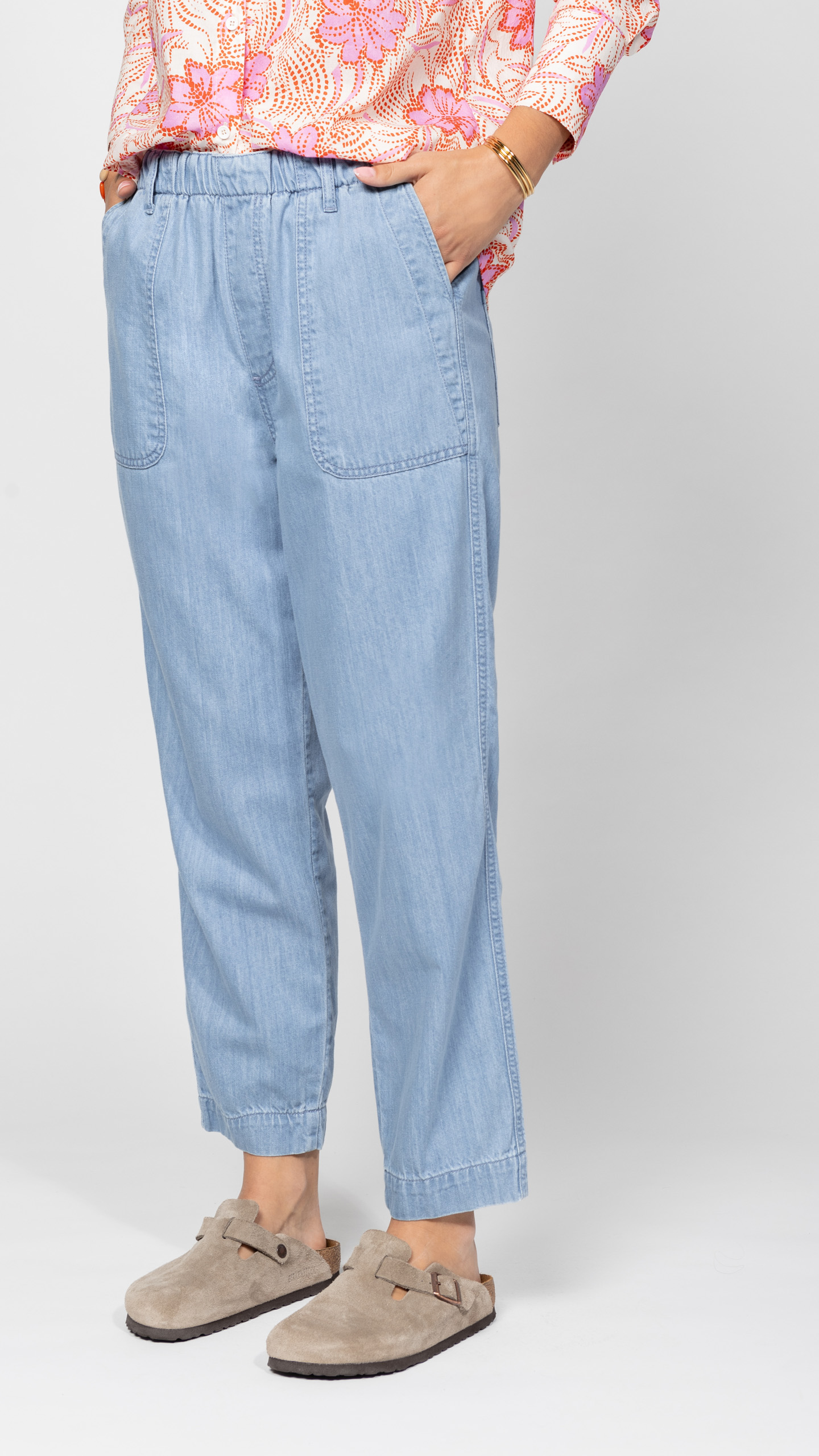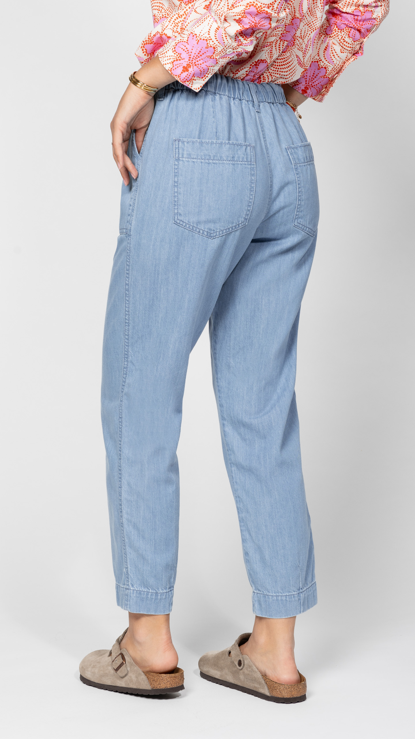 Le pantalon Ophélia en denim light blue est le must-have estival.