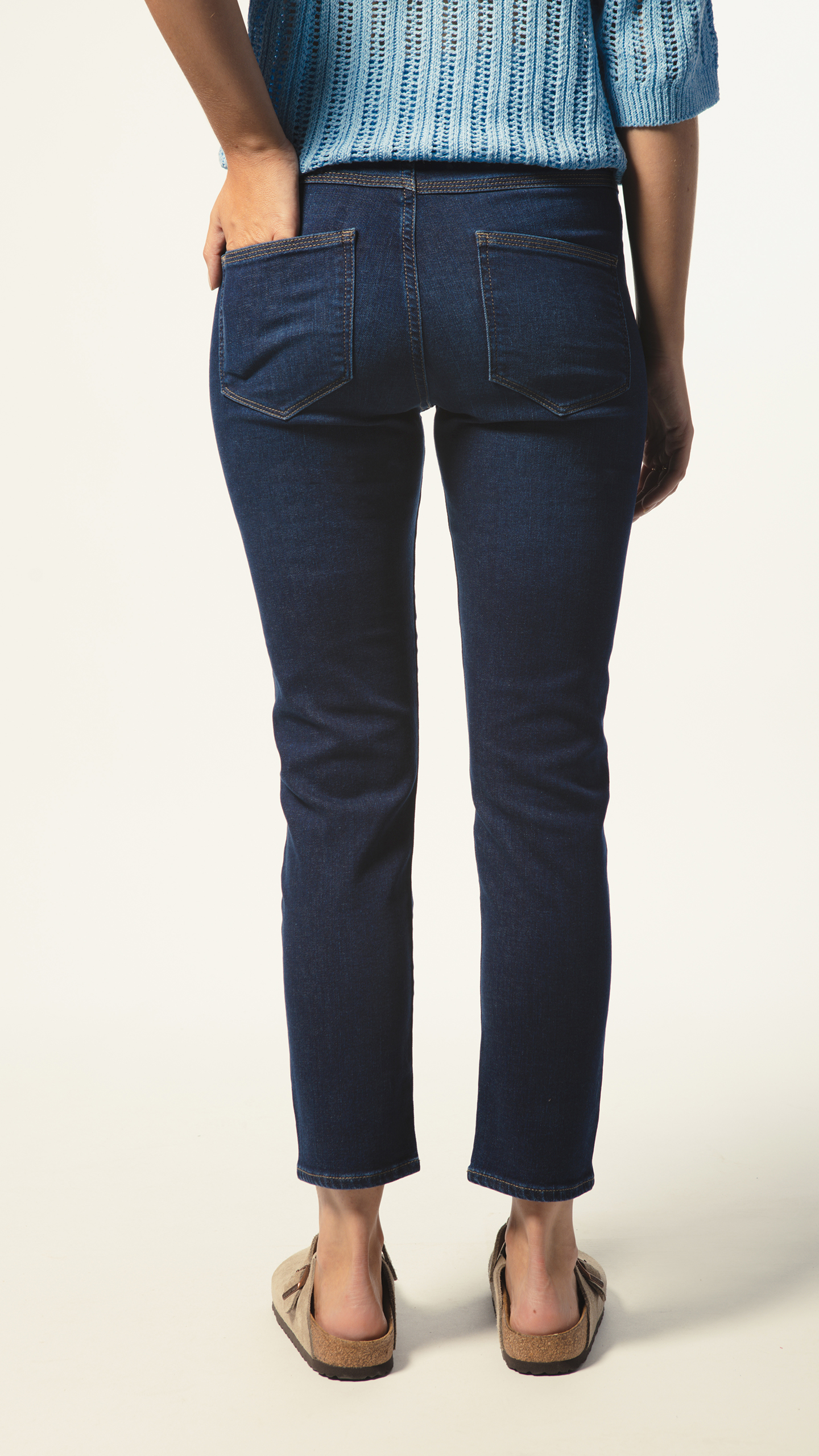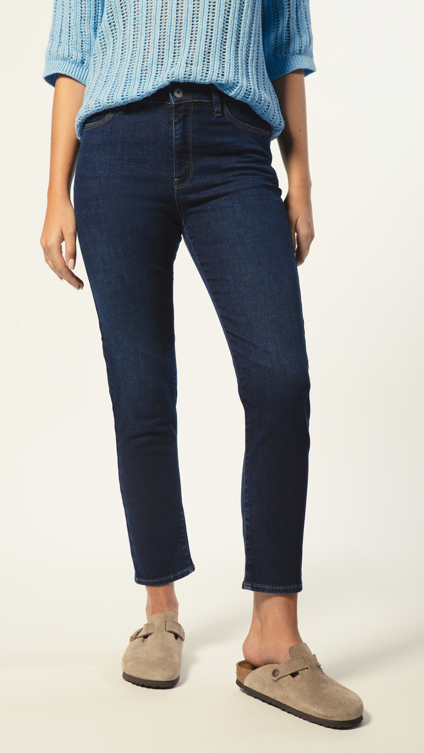 Jean slim, taille haute, et jambe crop.