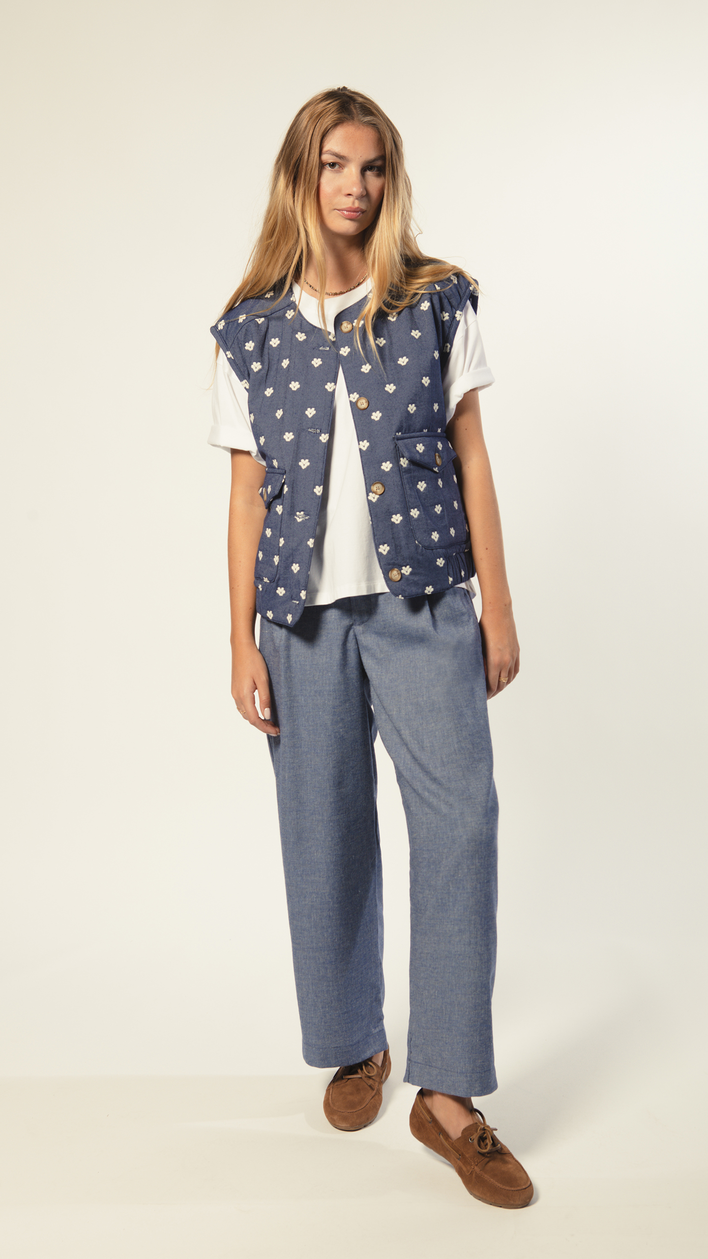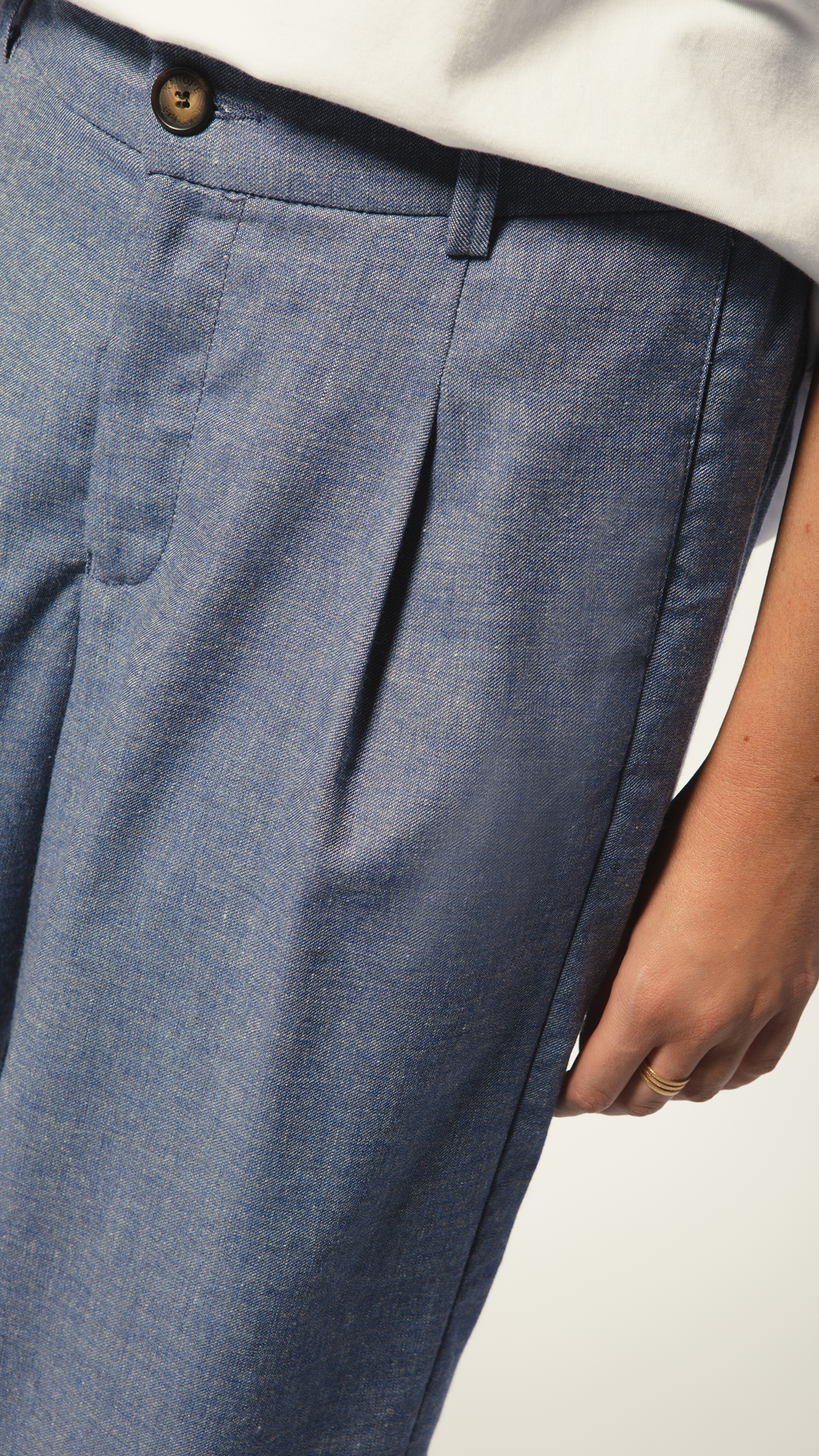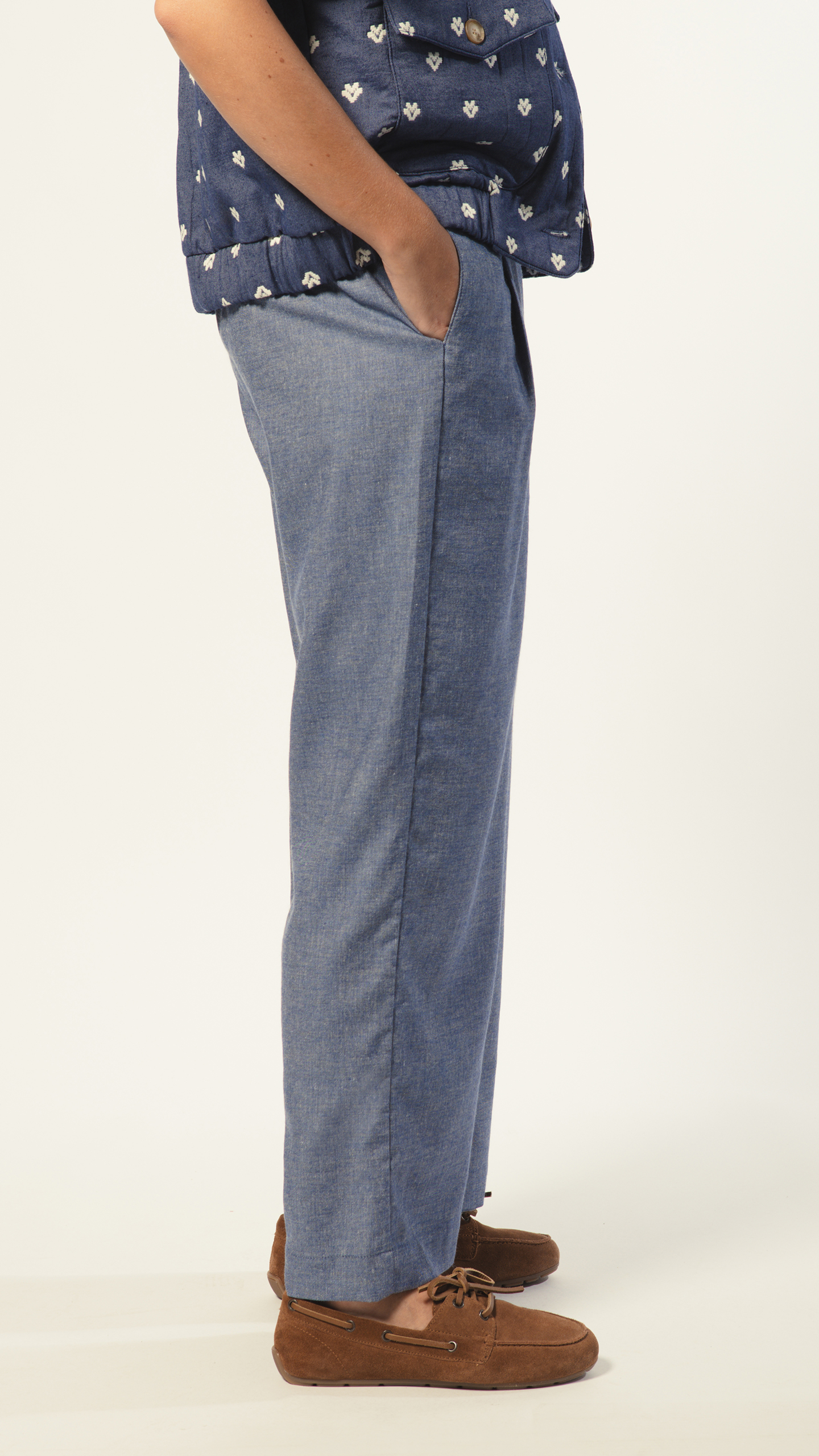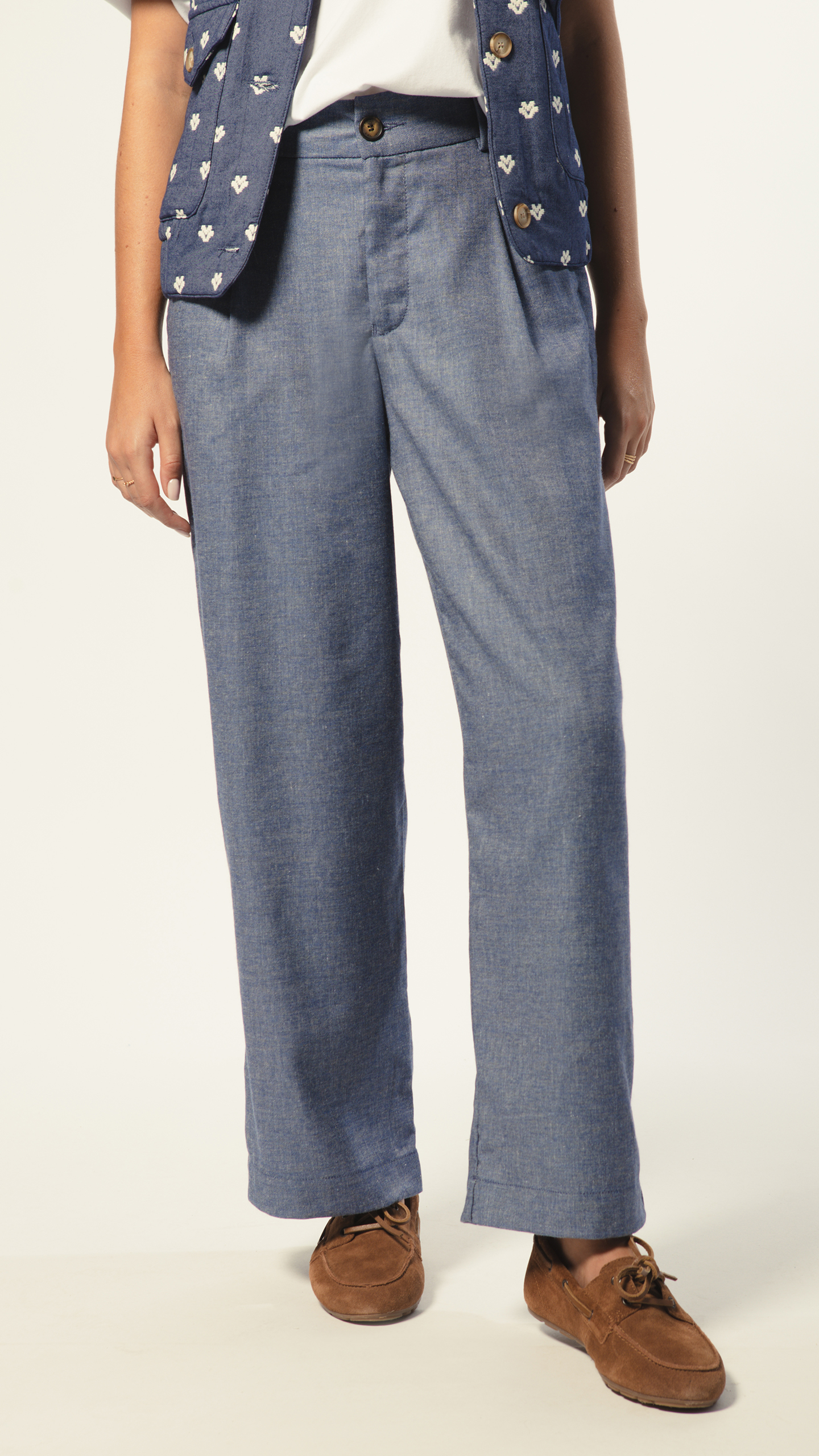 Le Martina revient dans un bleu chiné léger et aérien, le pantalon parfait pour vos journées d’été.
