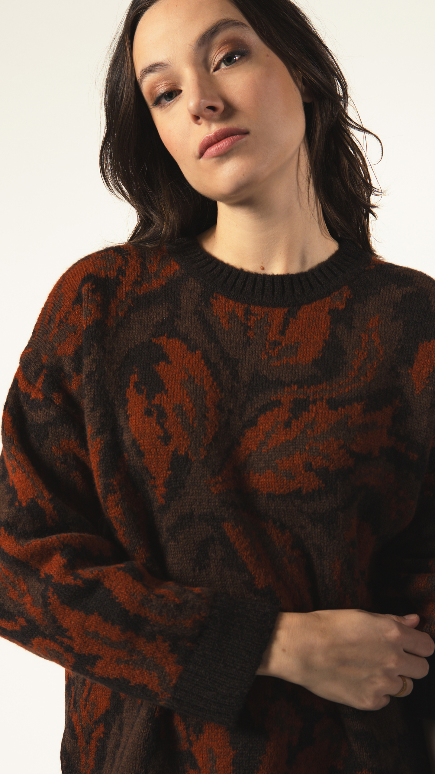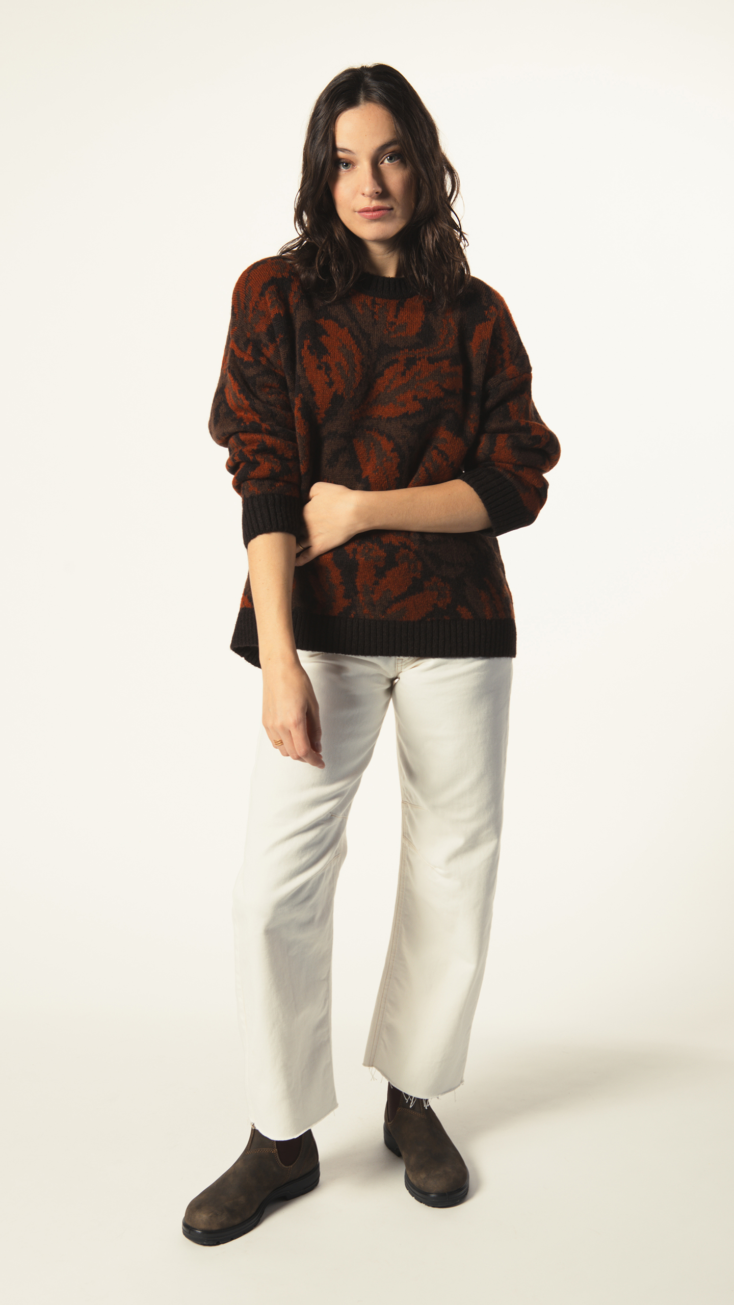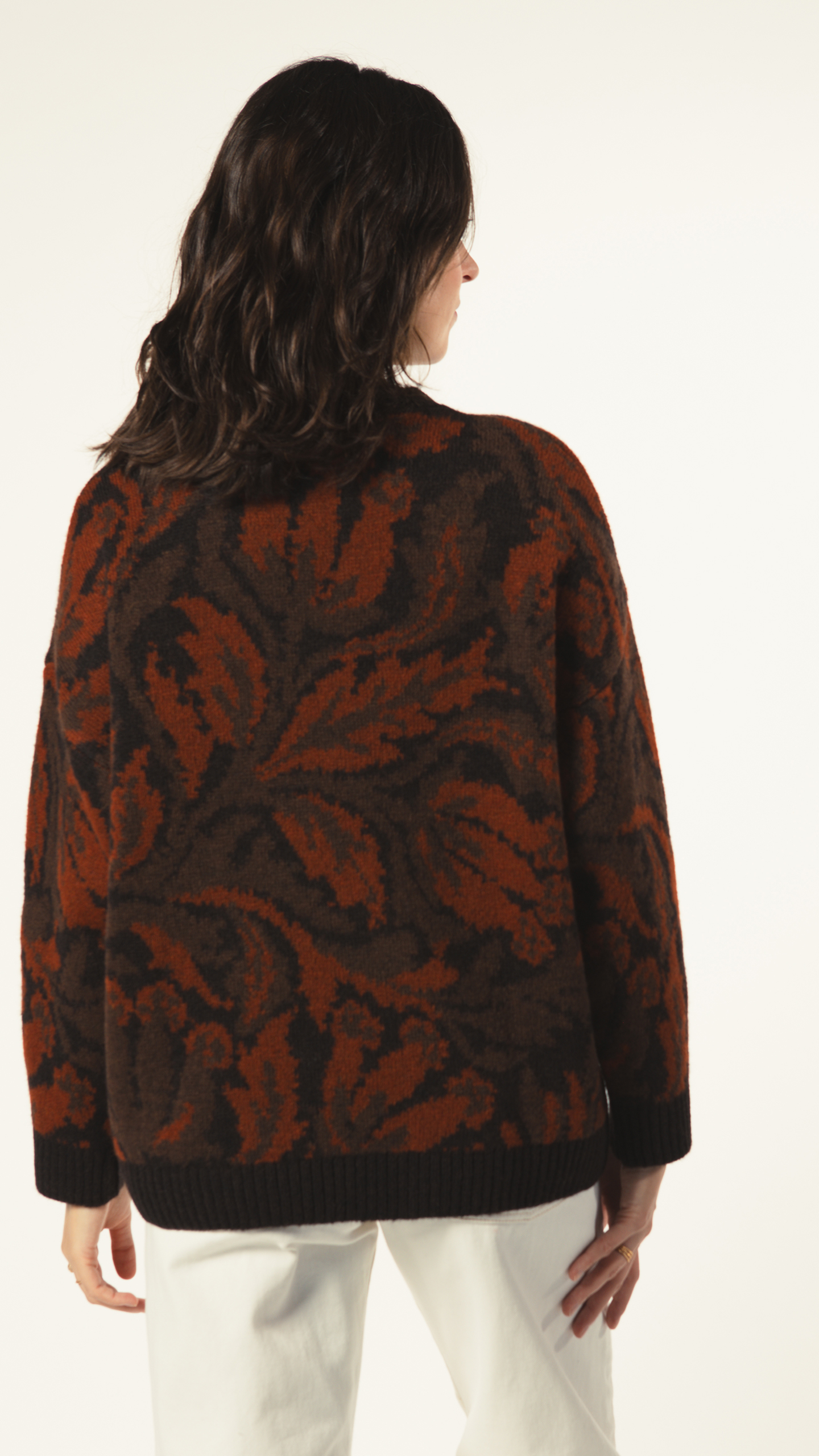 Pull oversize en jacquard feuillage – fabriqué en Italie, une maille douce et graphique qui apporte du style sans effort.