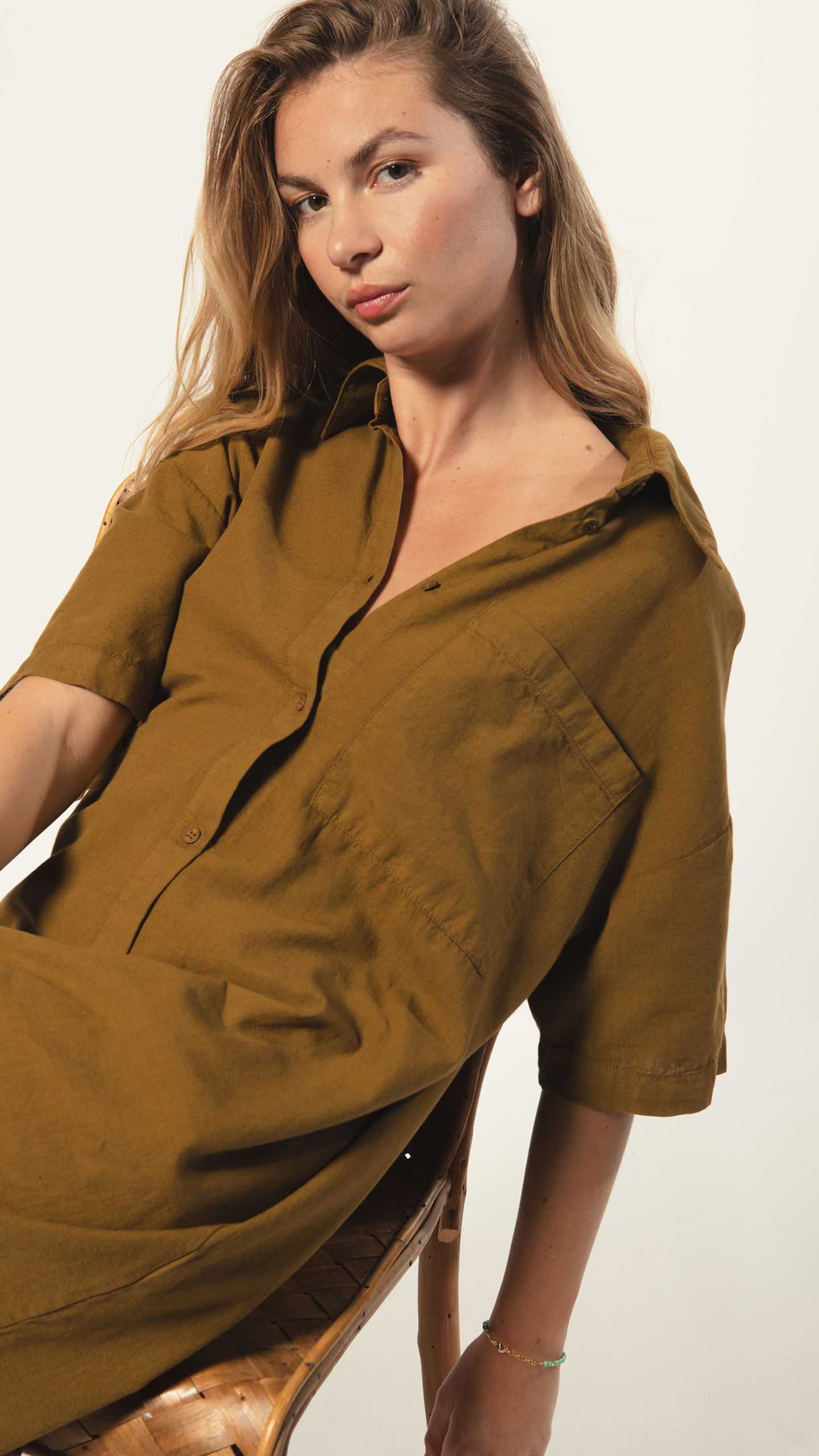 La robe chemise Maya se décline en coton-lin léger dans un joli coloris kaki.