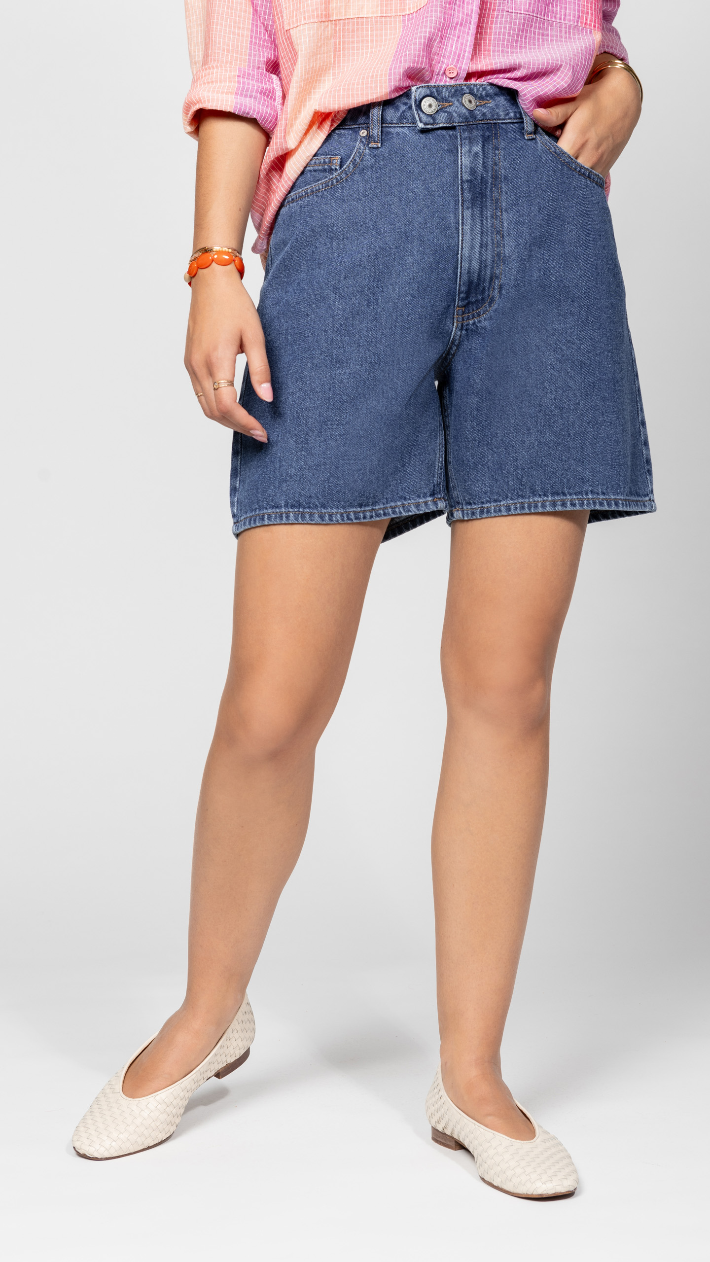 Short en jean, légèrement long. Détail double bouton à la taille, comfy, stylé et facile à mixer.