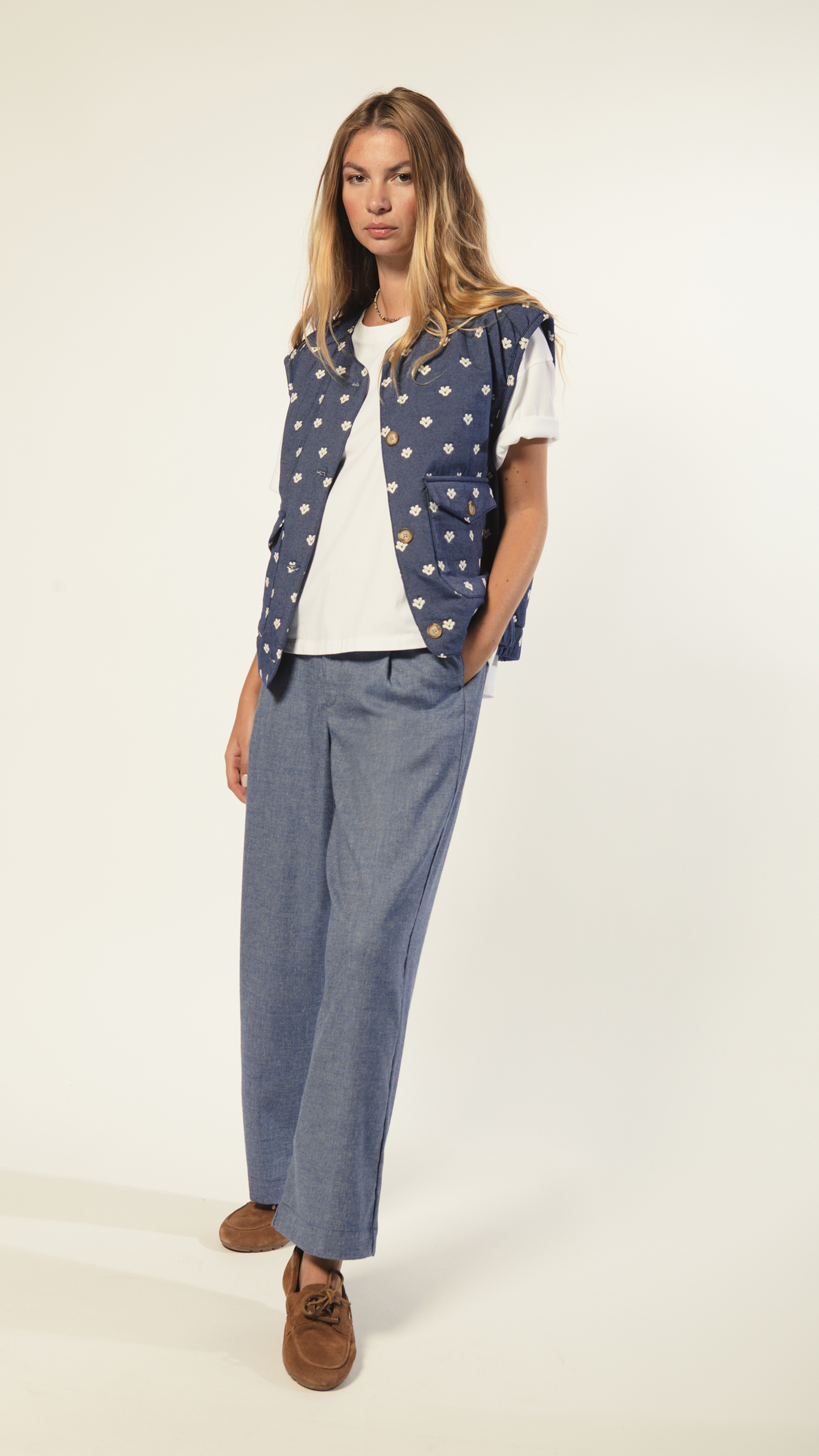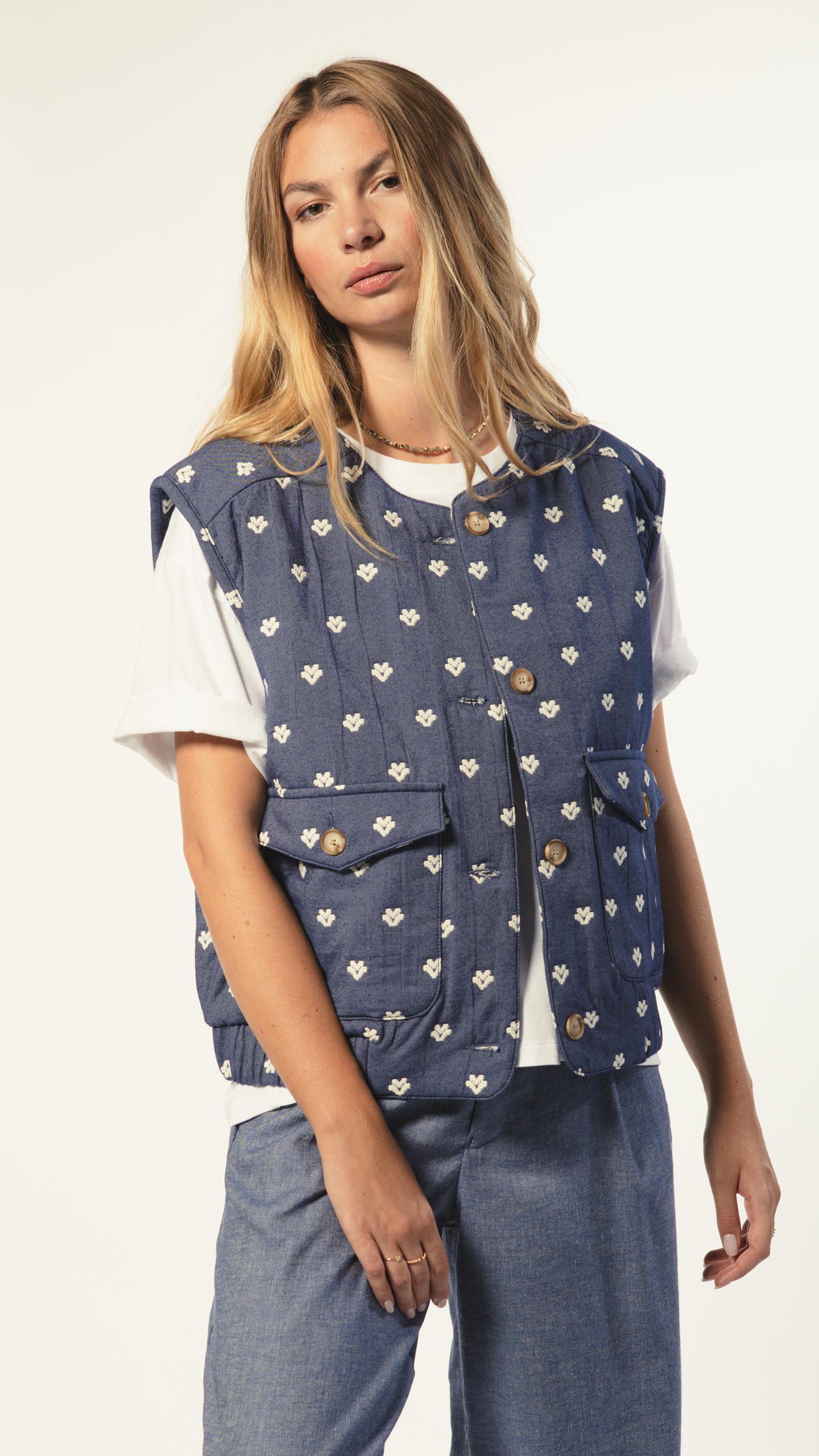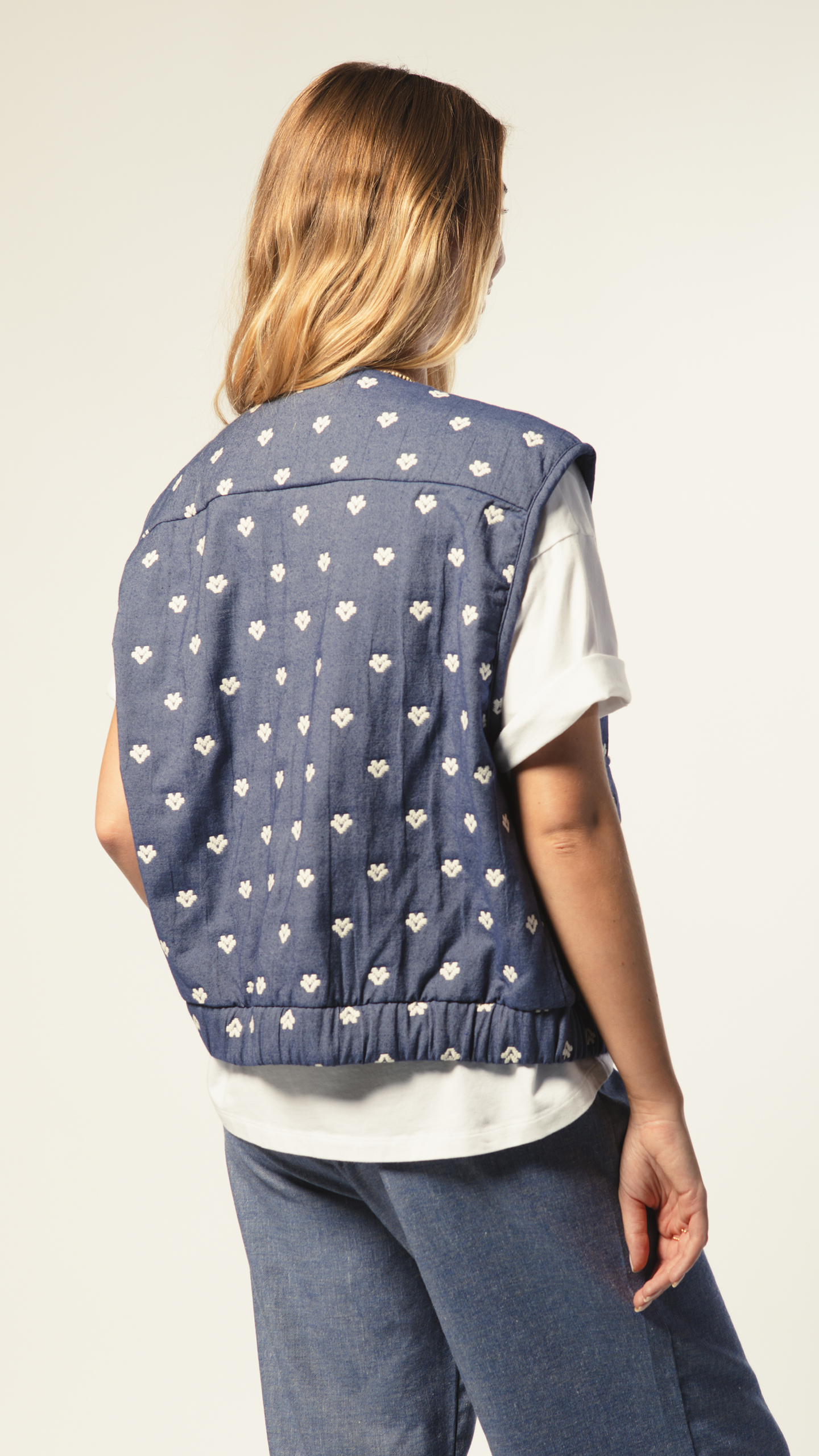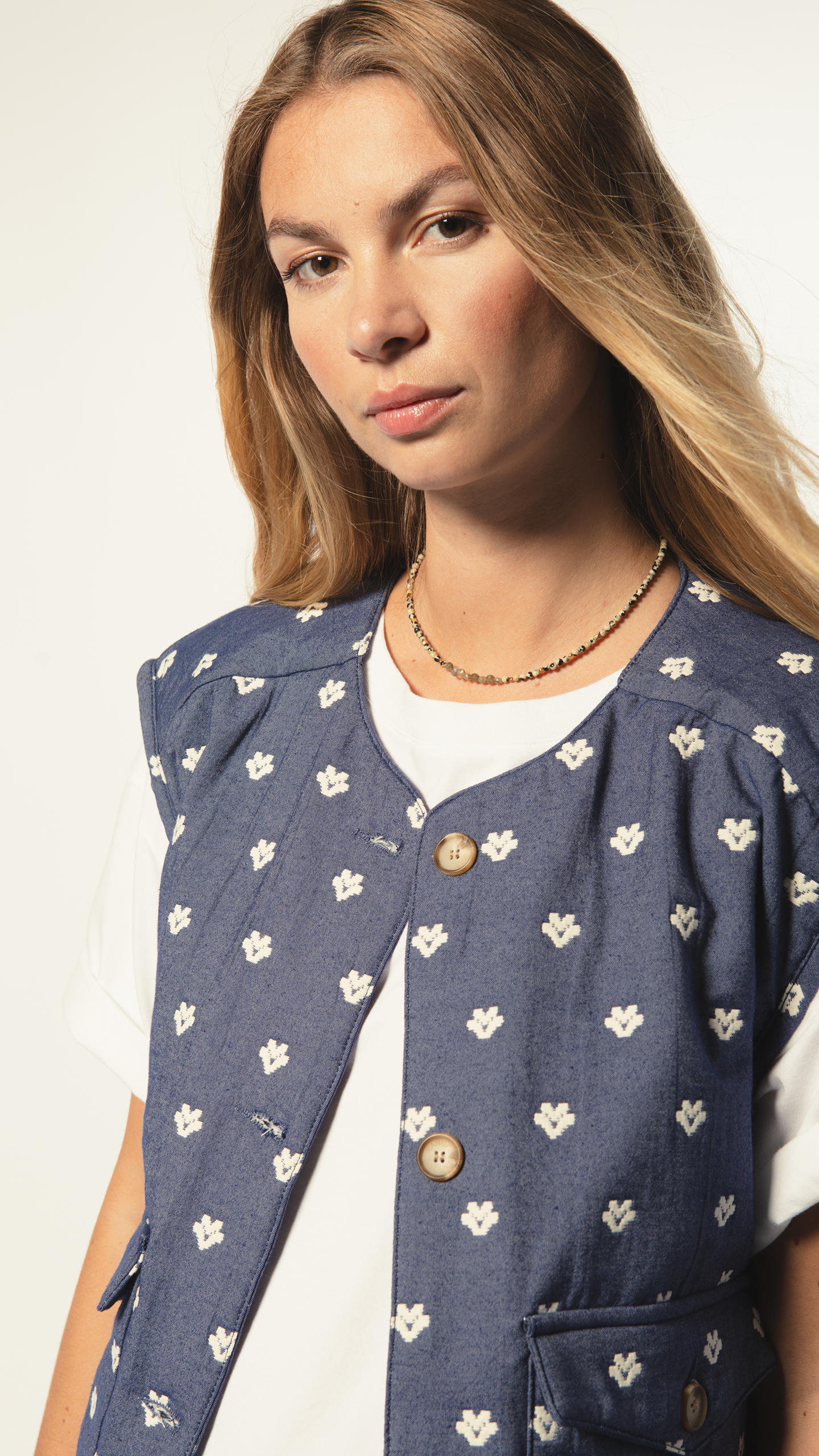 Veste sans manches légèrement resserrée à la taille. Superbe tissu Français jacquard aux petits motifs écru. Une vraie pépite, pièce forte qui apporte du style et du relief à vos looks